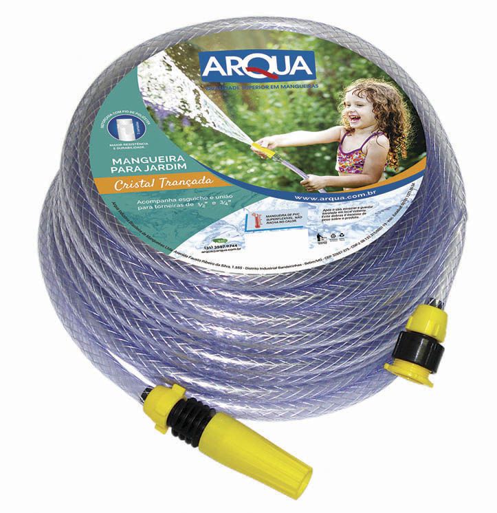 Conjunto para jardim, fabricado com mangueira de PVC flexível em três camadas: duas de PVC cristal, intercaladas por uma camada de fibra têxtil de poliéster, conferindo ao produto ótima qualidade e durabilidade quando submetido a pressões domésticas e uso contínuo. Montada e embalada com esguichos e conexões especiais para torneiras de 1/2” e 3/4”.